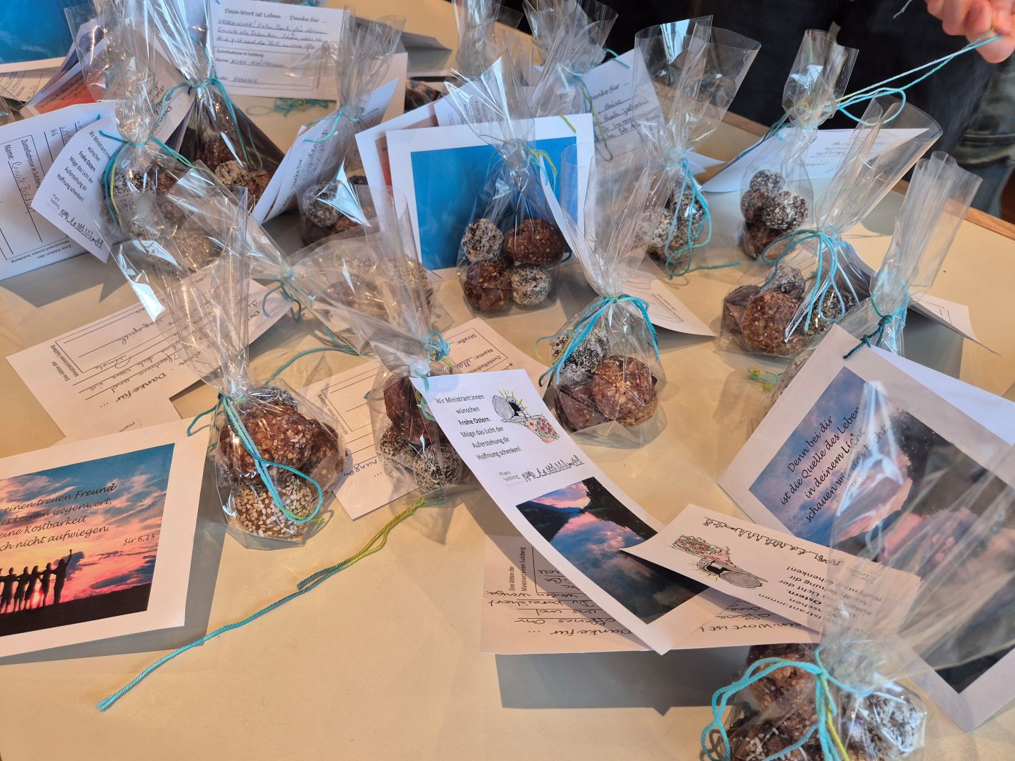 Am Mittwochvormittag trafen sich 17 Ministrant:innen um die Fastenaktion ‚Dein Wort ist Leben‘ abzuschließen. Drei Wochen lang waren die Menschen eingeladen Dankekarten an Sulzberger:innen zu schreiben. Die Minis machten ‚Energieballs‘, eine kleine Osterkarte von den Minis und stellten die Dankekarten in der Karwoche zu. 49 Karten und ‚Energiesäckchen‘ wurden verteilt.