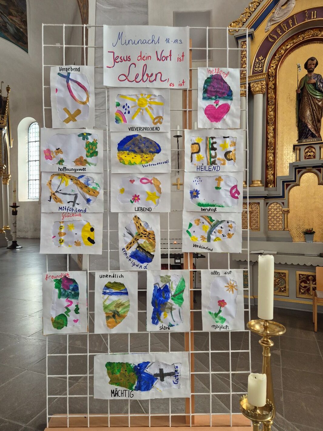Vom 18. auf den 19. März trafen sich 18 Ministrant:innen im Haus zur Marienlinde zur Mini-Nacht. Gemeinsam reisten wir mit Spielen in das Land Israel. Jesu Wort ist Leben und mit Jesu Worten setzten sich die Ministrant:innen auseinander und suchten zu den einzelnen Bibelstellen Schlagworte, wie Jesu Worte für die Menschen damals und für uns heute wirken, z.B.