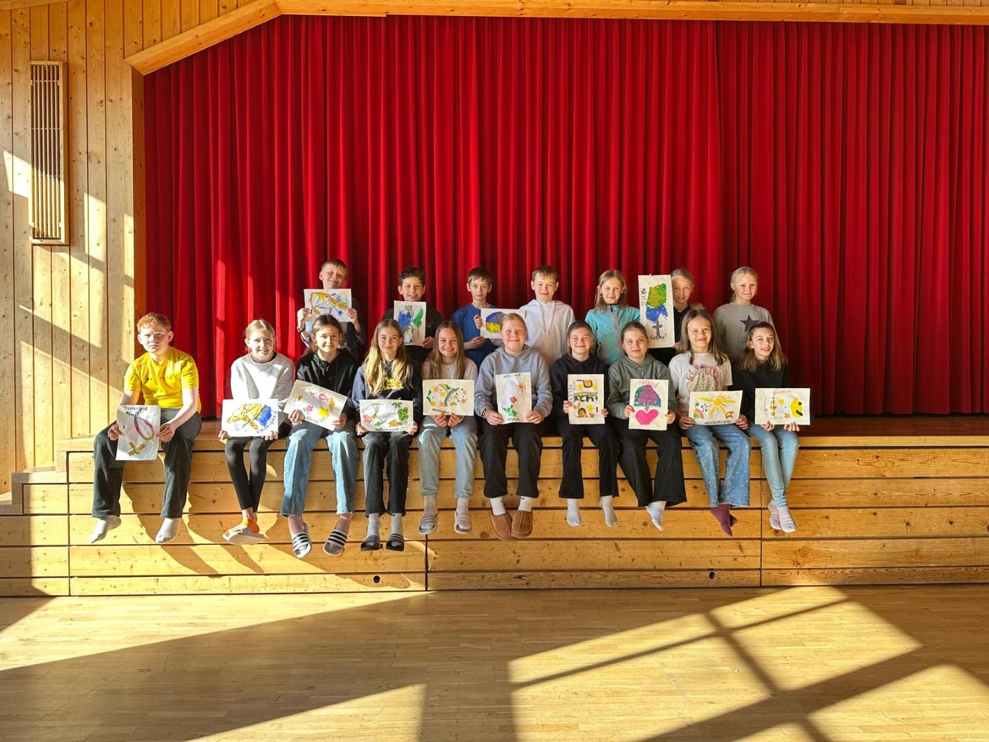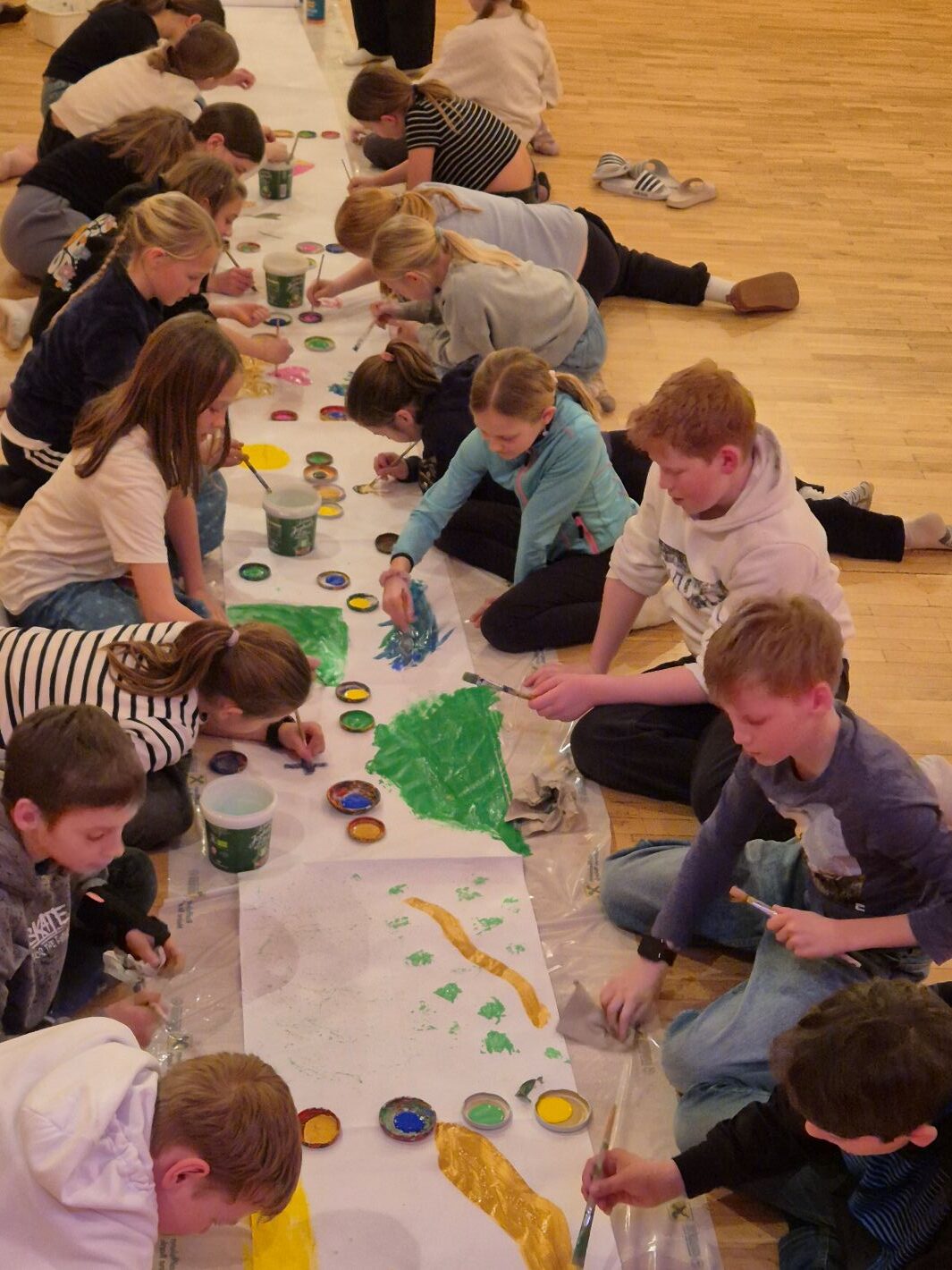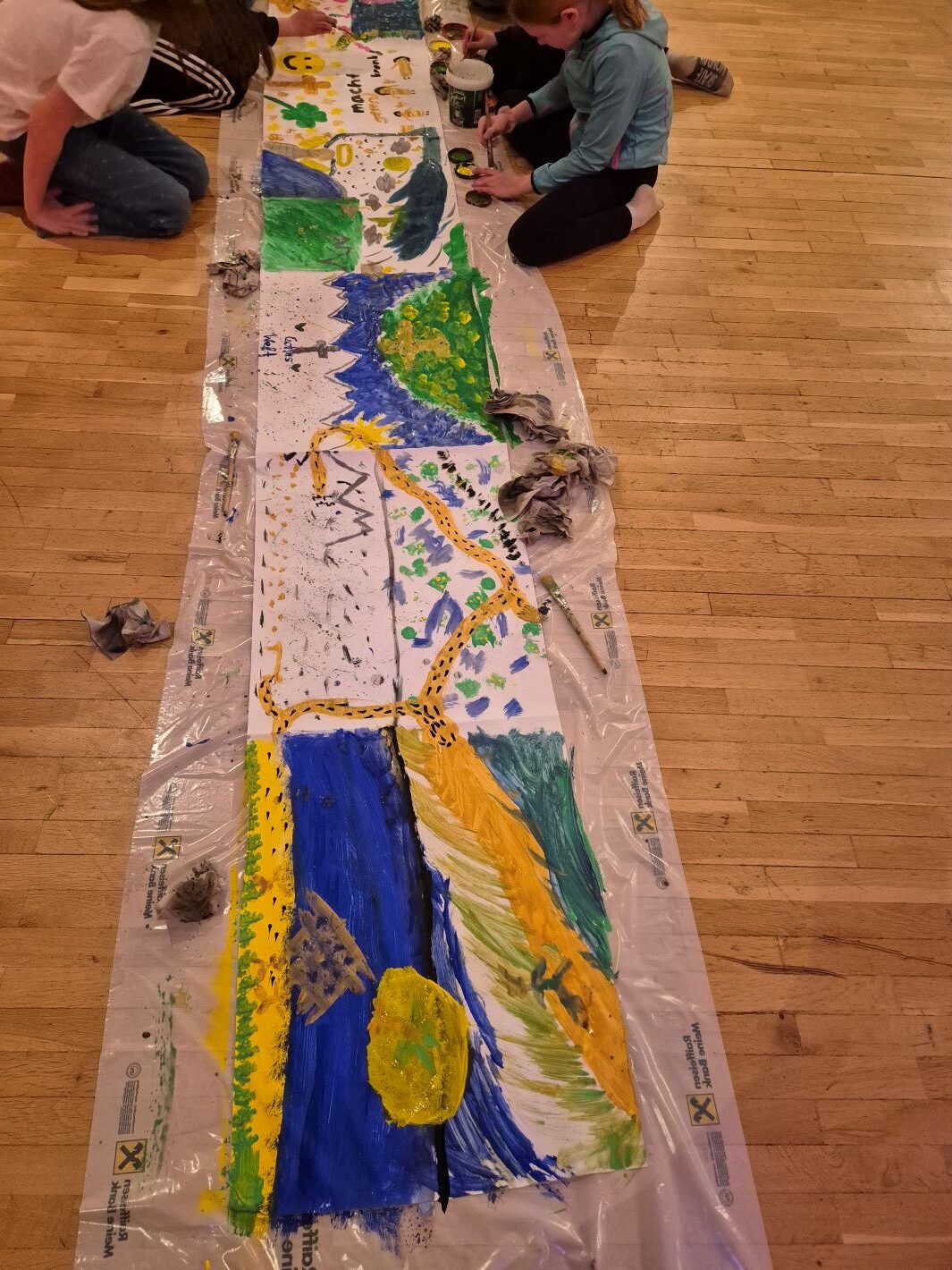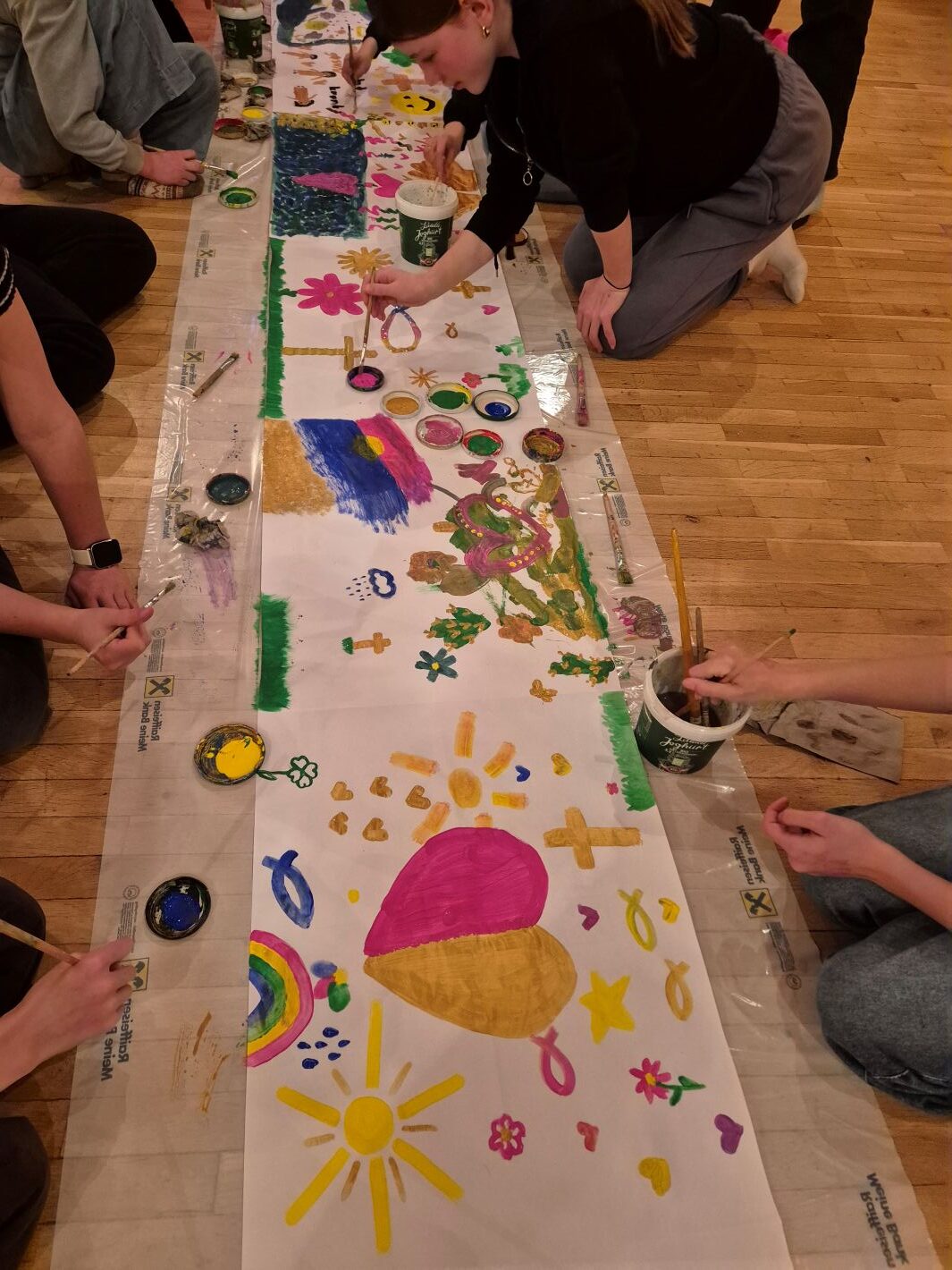 Es war erstaunlich, wie viele Worte den Minis zu den einzelnen Bibelstellen einfielen. Mit Farben und Symbolen wurden Jesu Lebens-Worte auf ein langes zusammenhängendes Papier gemalt und dann Bilder aus dem Gemeinschaftsbild für Jesu Worte ausgeschnitten.
